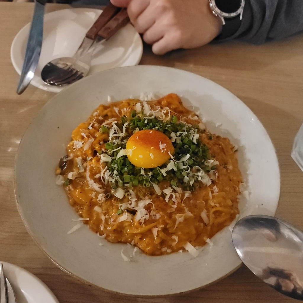 두 번째 메뉴는 매콤 로제 리조또입니다. 제가 매운 음식을 좋아하여 시키게 된 메뉴인데, 매운 정도를 조절할 수 있던 것으로 기억합니다. 매운 것을 좋아하는 저는 잘 먹었지만, 매운맛에 익숙하지 않은 분들은 덜 맵게 해달라고 요청하는 게 좋을 것 같아요. 사진에서는 살짝 면처럼 보이는데 파스타가 아니고 리조또입니다. 스테이크와 같이 먹으니 매콤함이 입맛을 살짝 돋워주어서 궁합이 좋았습니다.